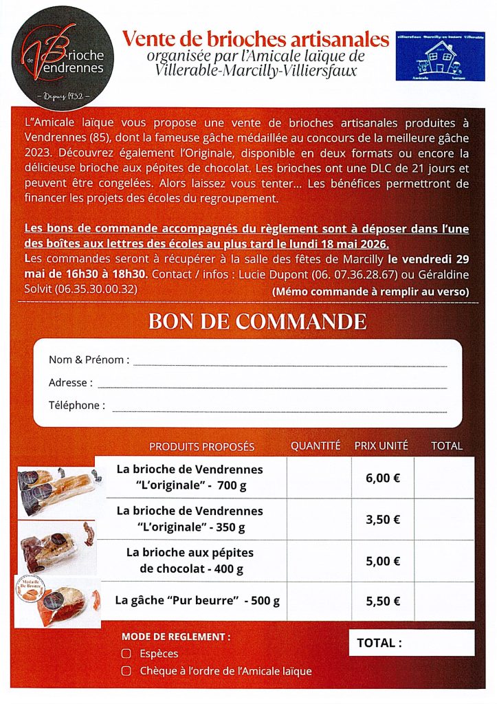 VENTE DE BRIOCHE AMICALE LAIQUE VILLERABLE MARCILLY VILLIERSFAUX